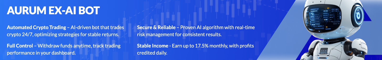 As of April 2026, AURUM's EX-Ai Bot is averaging about 17.4% per month.